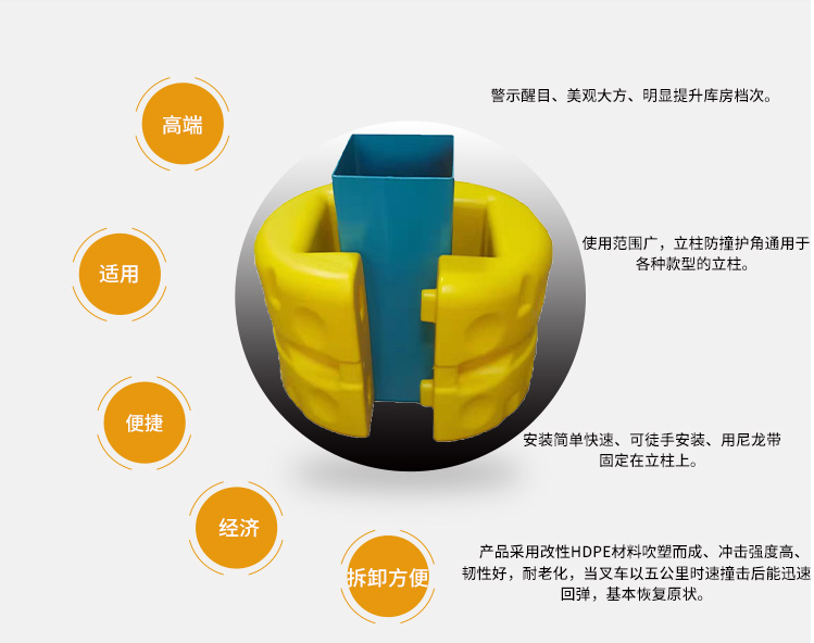 功能介紹:立柱防撞護套是專門為保護鋼平臺立柱以及建筑物支撐柱而設計的,采用改性LDPE材料吹塑而成,中空結構,雙層保護。當立柱受到叉車等 設備撞擊時,能量被護套緩沖吸收,不僅保護了立柱,也保護了搬運設備。